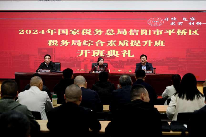 为深入学习贯彻习近平新时代中国特色社会主义思想和党的二十届三中全会会议精神,推进信阳市税务工作高质量发展,10月21日下午,国家税务总局光山县、平桥区税务局综合素质提升班在我校开班。信阳市光山县税务局副局长陈绪平、平桥区税务局副局长张黎、太阳成集团tyc539副校长杨钧、太阳集团tyc539MACAU院长田大治出席开班典礼。此次培训班来自信阳市光山县、平桥区税务局的党员、干部、职工共计130余人参加培训。