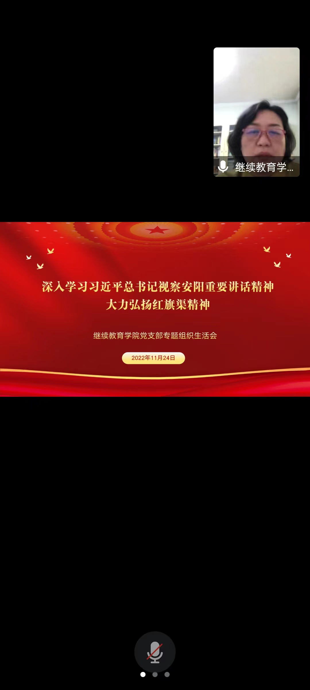 会议首先深入学习了习近平总书记视察安阳重要讲话精神;随后集中观看了专题片《根脉——红旗渠精神》,通过纪录片了解当时红旗渠修建的历史背景和艰苦的修建过程,领悟红旗渠精神“自力更生、艰苦创业、团结协作、无私奉献”的丰富内涵和时代价值,会上,韩虹新书记、张兴昌院长带头讨论交流、谈感悟。韩虹新谈到,要牢牢把握时代主题,大力弘扬红旗渠精神,持续深化队伍建设,切实履行工作职责,守正创新,坚定不移推进全面从严治党,充分发挥党联系群众的桥梁纽带作用,带领党员同志们充分发挥先进模范带头作用,把党组织建设得更加充满活力、更加坚强有力,用高质量党建促推学院高质量发展;张兴昌就如何学好用好、躬身践行红旗渠精神进行了发言,他结合学校疫情防控的实际工作情况,充分肯定了我院教职工在学校核酸检测工作协调组团结协作、无私奉献的出色表现,希望大家将红旗渠精神践行于实际工作中。最后韩书记对大家下一步的工作提出了具体要求,一是全体党员干部要提高政治站位,把学习贯彻习近平总书记视察安阳的重要讲话与学习宣传贯彻党的二十大精神紧密结合起来,大力弘扬红旗渠精神,坚持“讲政治、重担当、做表率、开新局”的基本工作要求。二是要强化学习意识、使命意识、奋斗意识,自强不息、求真务实、团结协作、精益求精,奋力开创继续教育工作新局面。