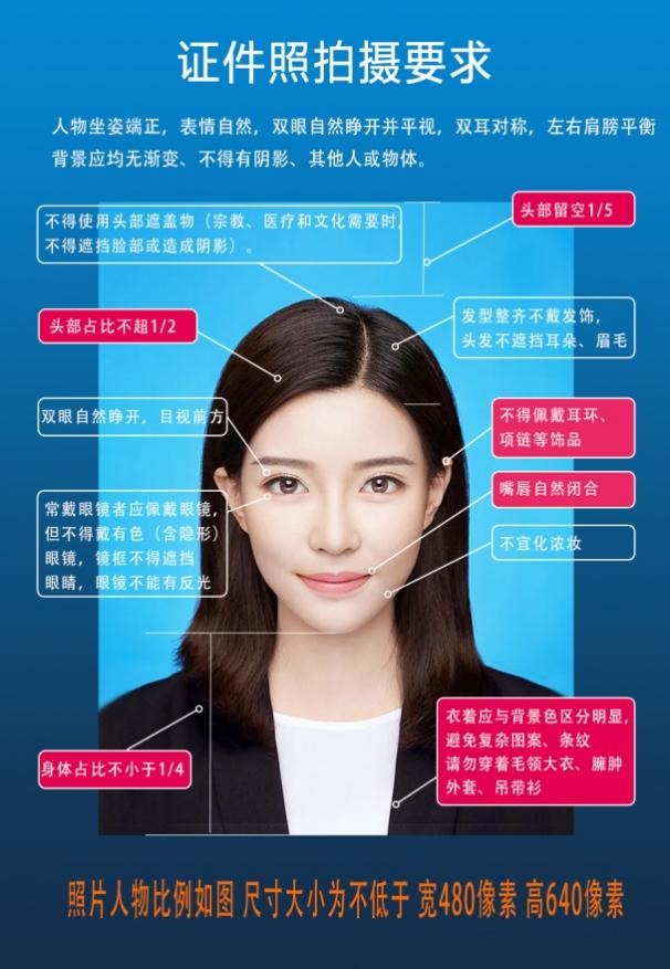 4、采集时一定真实表达学生本人相貌,请勿画浓妆和美颜,尽量使用手机自带相机拍摄或到照相馆照相后在线提交,禁止对图像整体或局部进行镜像、旋转等变换操作,不得对人像特征进行修饰处理,不得添加边框、文字、装饰图案等其他内。图像信息须正面免冠照,禁穿蓝色衣服(背景为自动生成天蓝色),具体要求见下图。