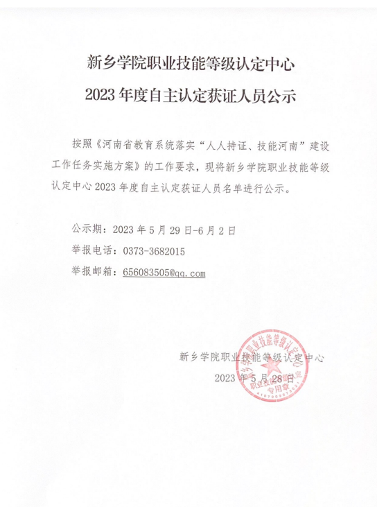 太阳成集团tyc539职业技能等级认定中心2023年度自主认定获证人员公示
