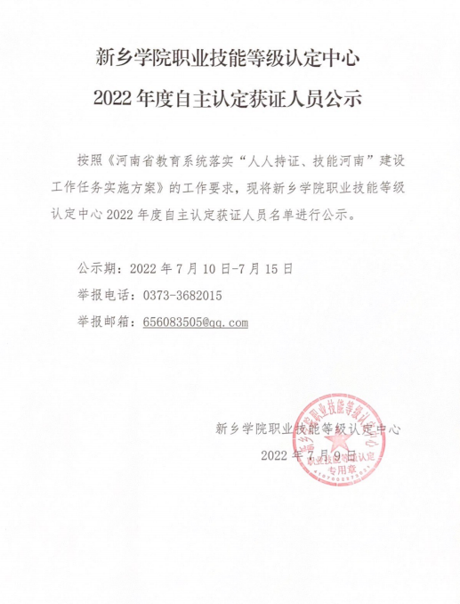 太阳成集团tyc539职业技能等级认定中心2022 年度自主认定获证人员公示