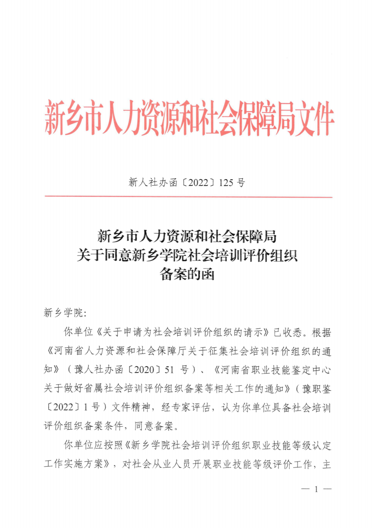 近日,新乡市人力资源和社会保障局发布《关于同意太阳成集团tyc539社会培训评价组织备案的函》(新人社办函〔2022〕125号),同意我校成为社会培训评价组织备案单位,备案号为:S000041070013,有效期3年。自此,我校已顺利完成河南省人社厅社会培训评价组织备案,可面向社会先期开展电工、制图员、工程测量员、物业管理员、人力资源管理师等5个职业工种相应级别的技能等级的评价认定工作。